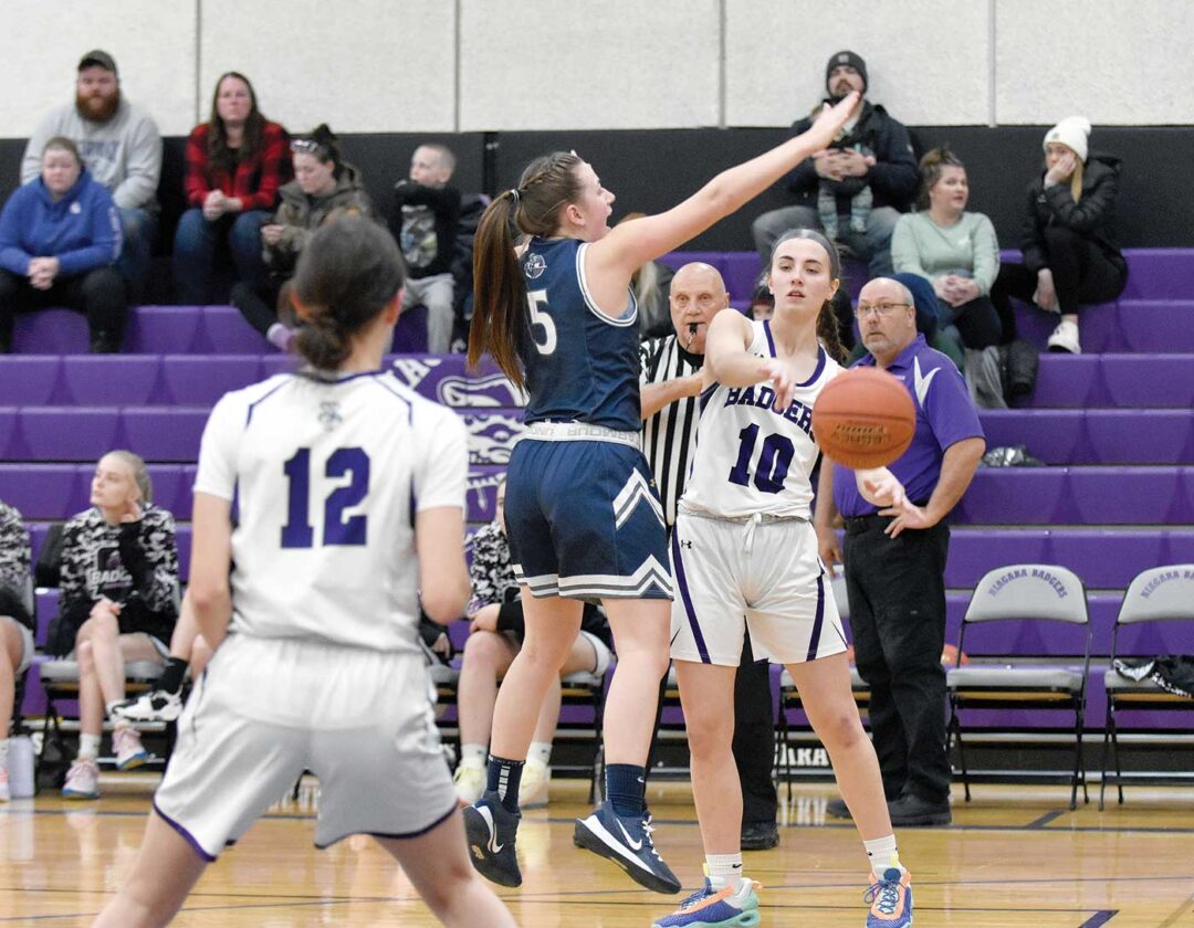 Niagara ballhandler Josie Rock (10) går rundt den defensive innsatsen til norske Taylor Adams (5), mens hun ser ut til å få ballen til lagkameraten Abby Wells (12) under den ikke-konferansebaserte college-basketkonkurransen for kvinner torsdag kveld på Niagara High School. Badgers klarte ikke å forsvare hjemmebanen sin, med de tilreisende Knights som gikk av med en 52-48 seier. (Foto: Dennis Mansfield/Daily News)