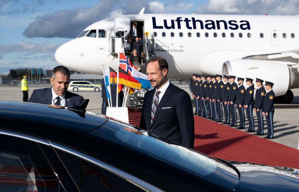 Litt før klokken 14 landet Lufthansa-flyet fra Norge i München med kronprins Haakon, representanter for den norske regjeringen og en næringslivsdelegasjon om bord. Sjefen for det bayerske statskanselliet, Florian Herrmann, ønsket kronprinsen velkommen på flyplassen.